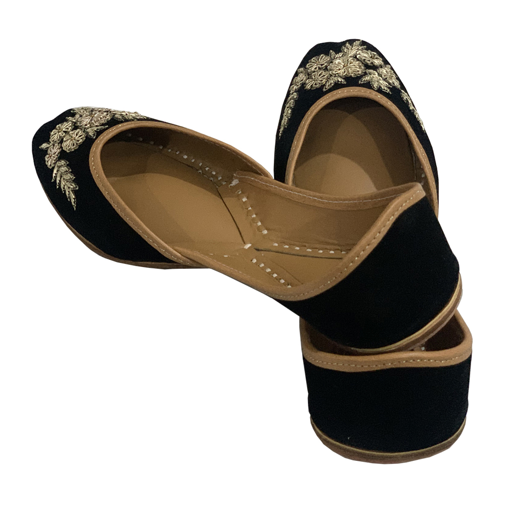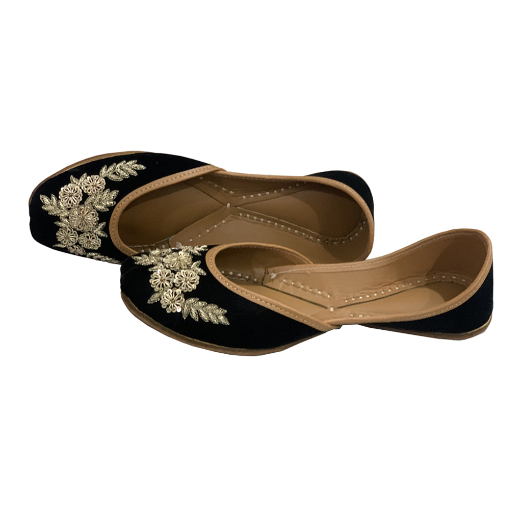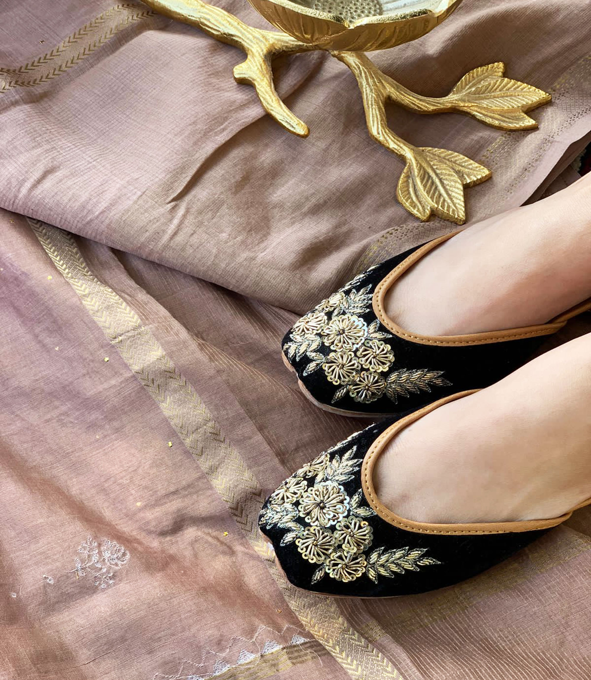 A combination of black velvet base with alluring zardozi floral embroidery wrapped around the front of these juttis are a blessing for your closet.