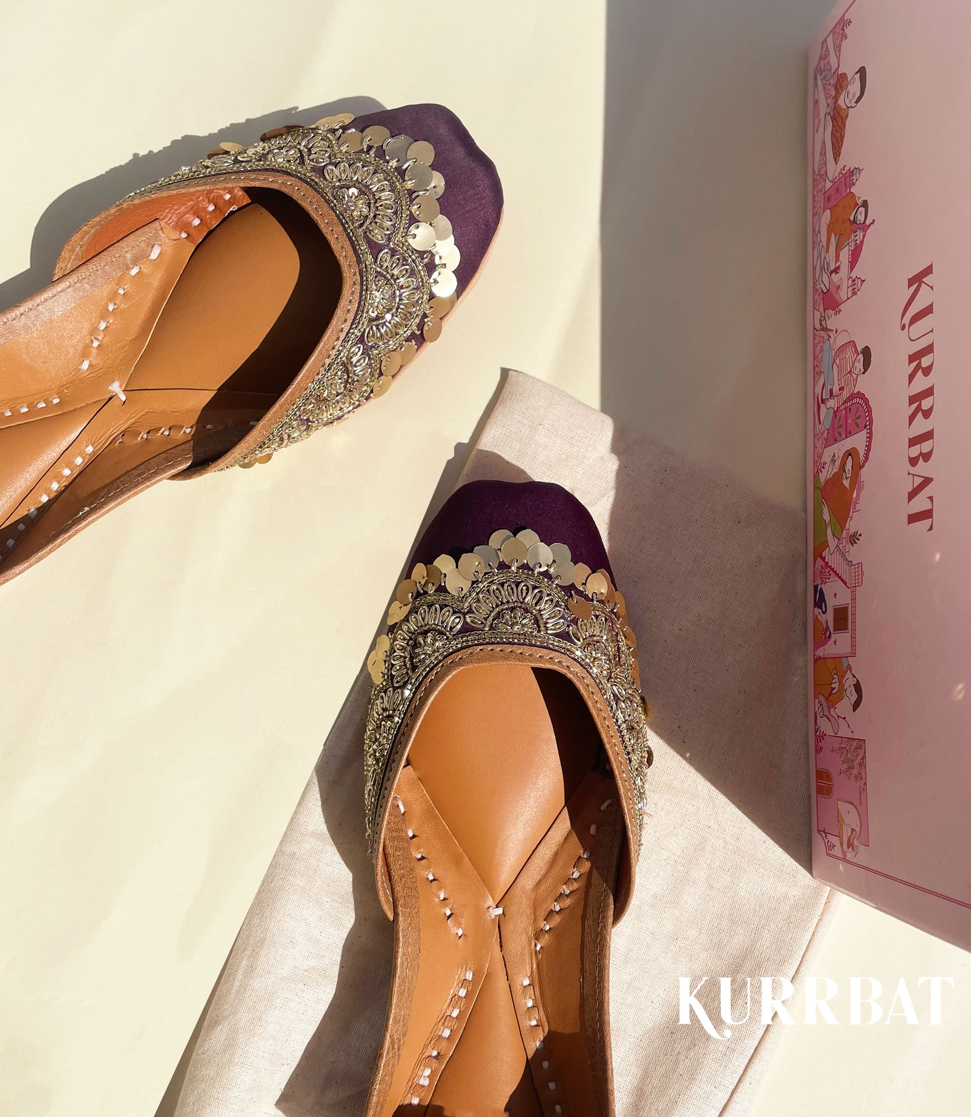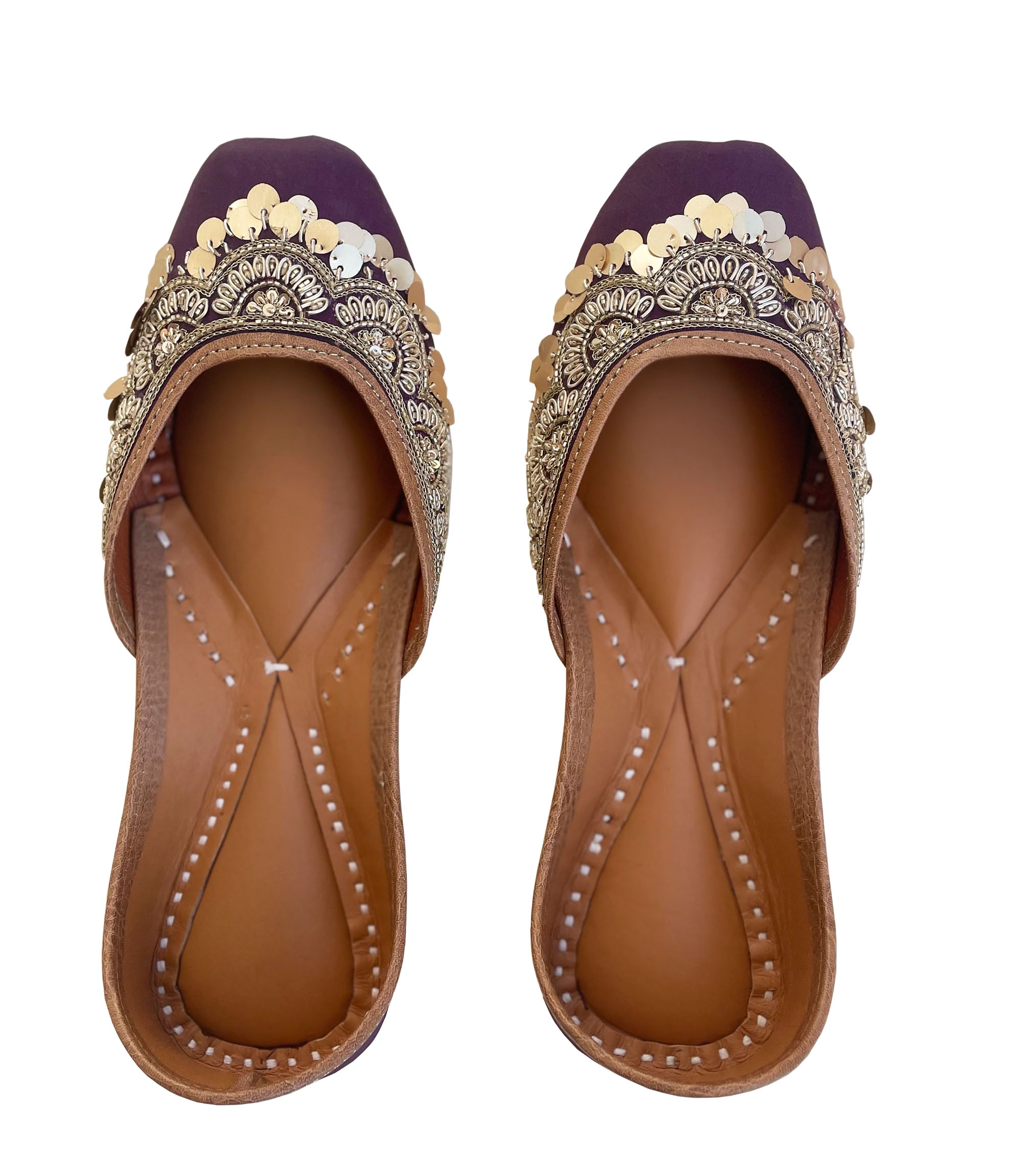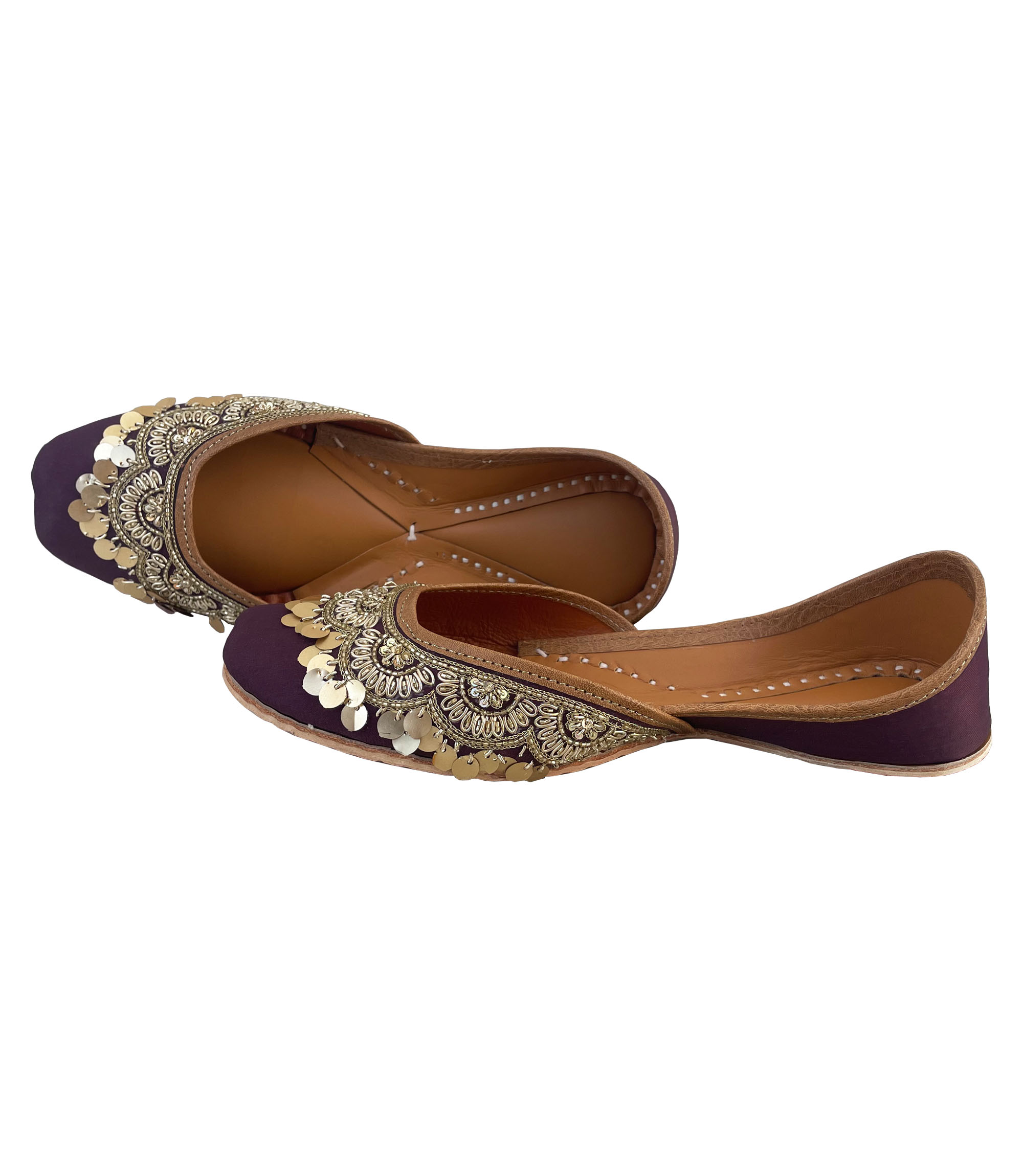 As the name suggests, this pair has a base of plum colour. Delicately embroidered with dabka and Cut Dana, this Jutti has golden hangings to enhance the beauty of this pair. Add some more zing to your outfit with Persian plum Juttis and make those heads turn!